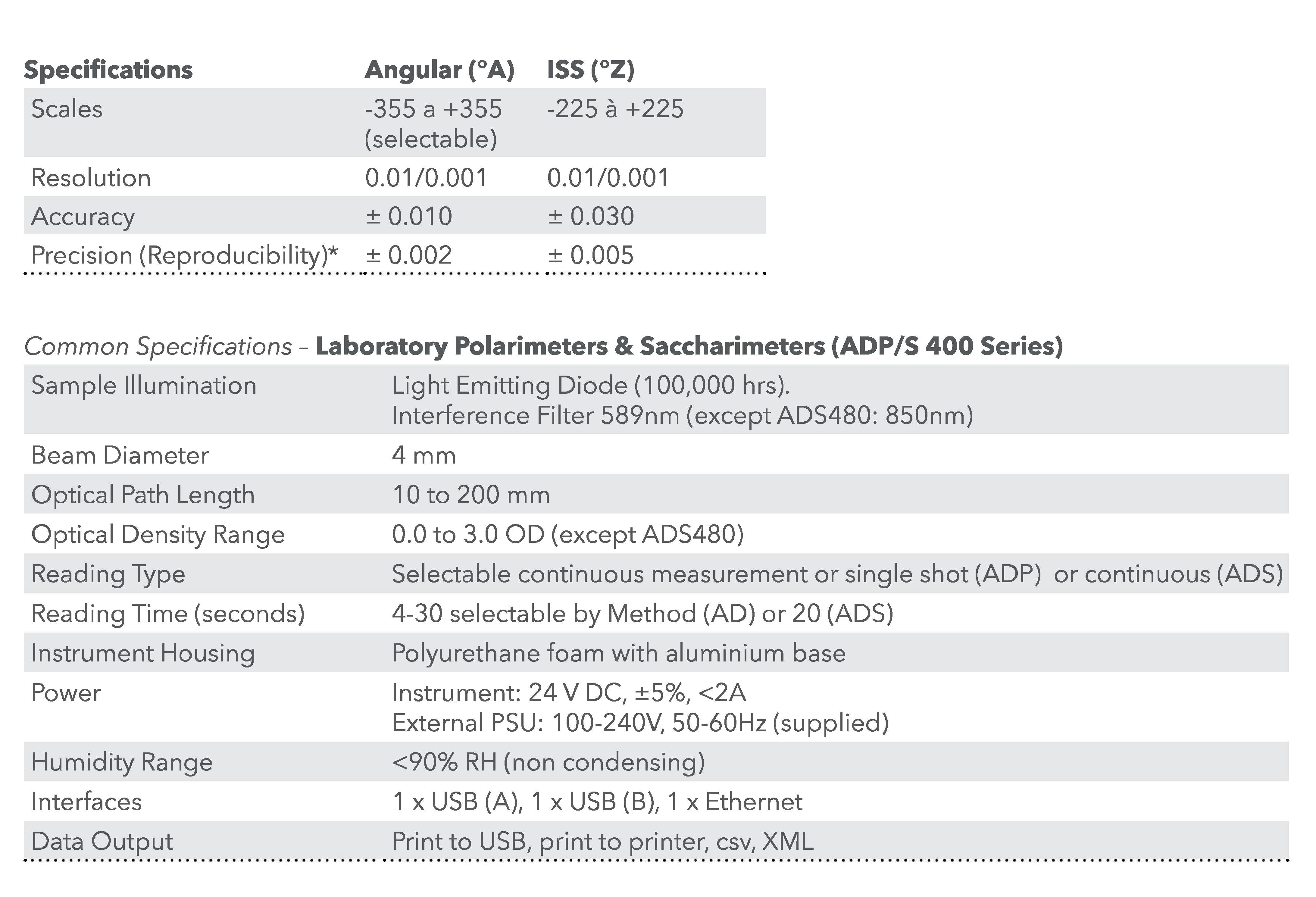 ADP400 시리즈인 범용 단일 파장 편광계는, 10~200mm 길이에 대해 소수점 3자리 분해능(ºA) 까지 측정해야 하는 설탕, 식품, 화학 및 제약 산업에 적합합니다.